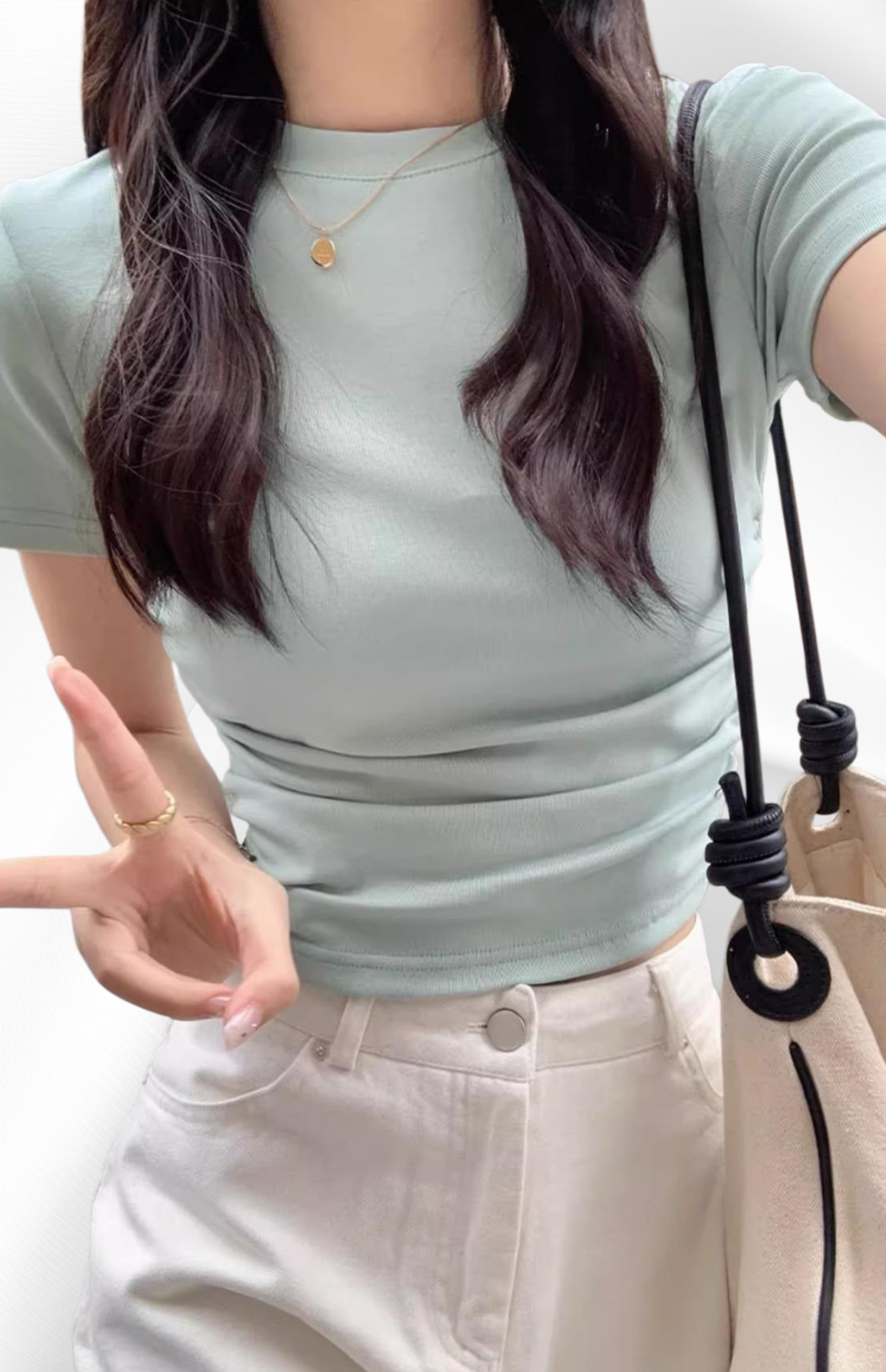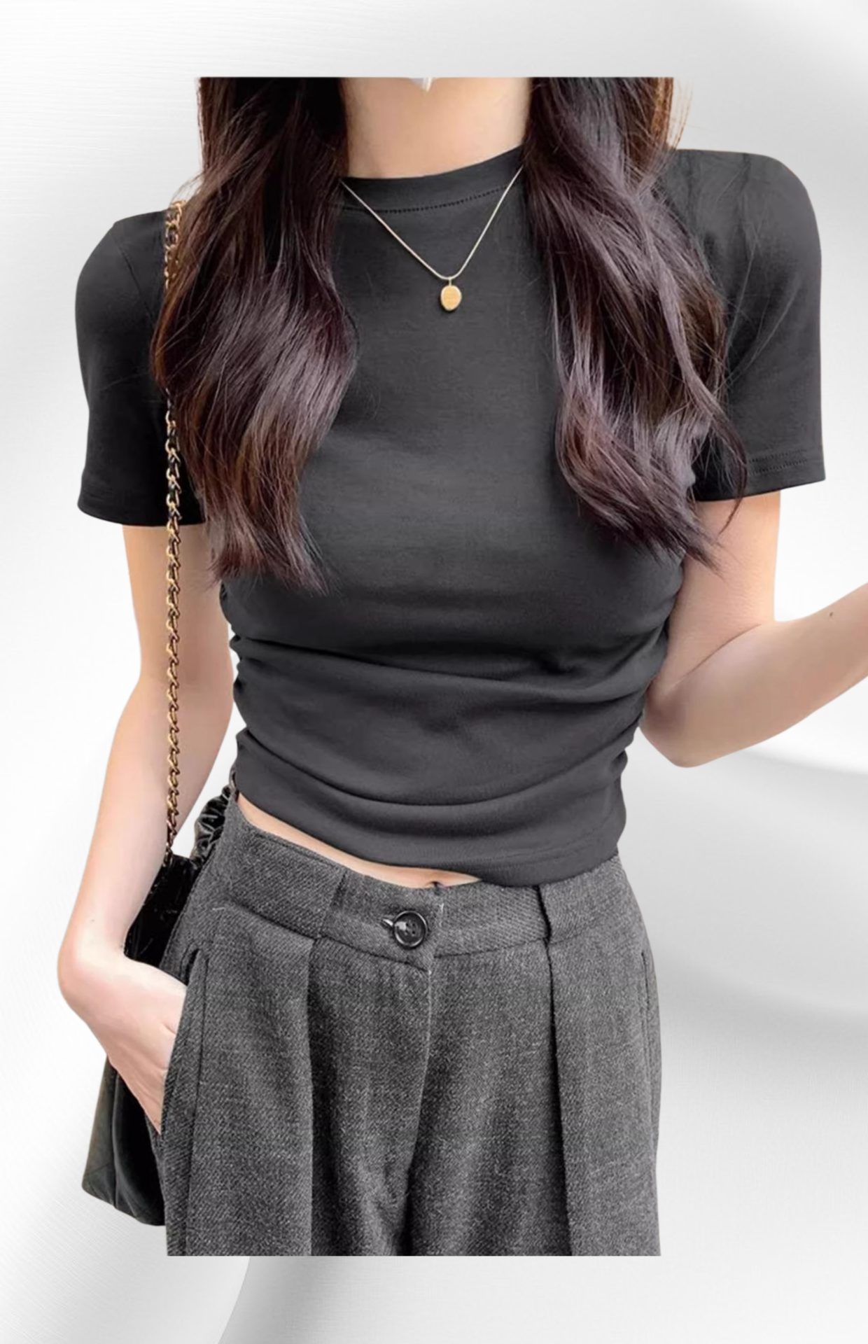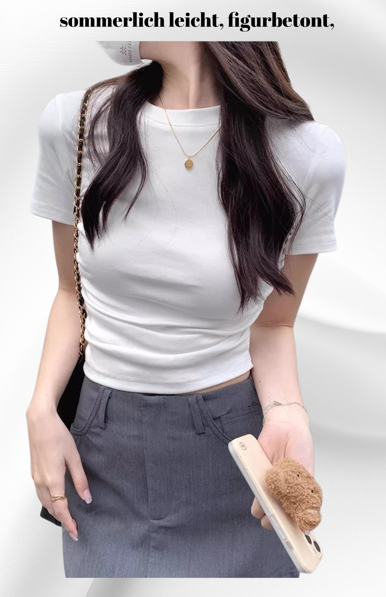 Modernes, figurbetontes Kurzarm-T-Shirt mit hohem Kragen für Damen. Weiches Material, unregelmäßiges Design, ideal für Sommer-Looks. Vielseitig kombinierbar für Alltag und Freizeit.