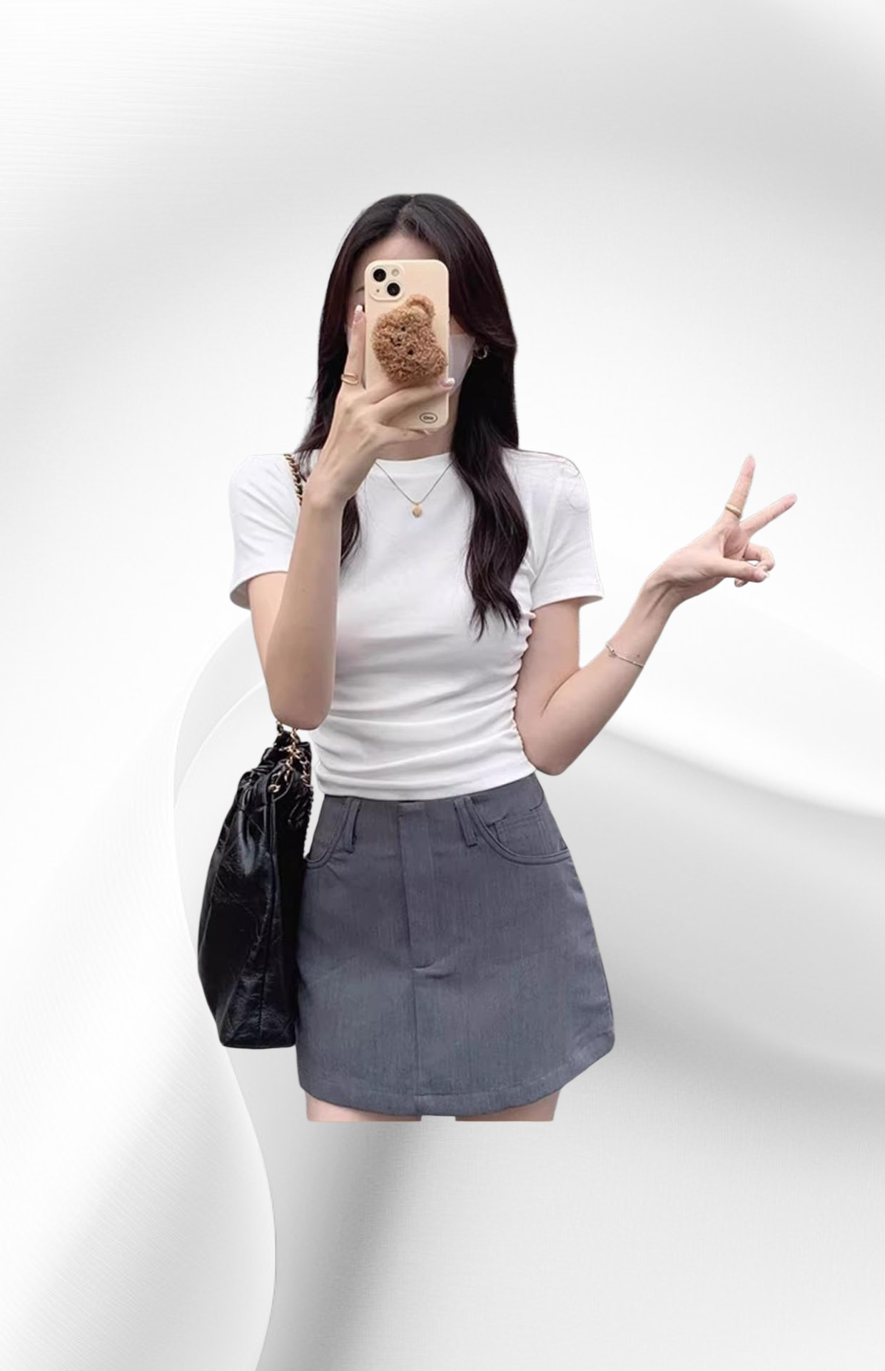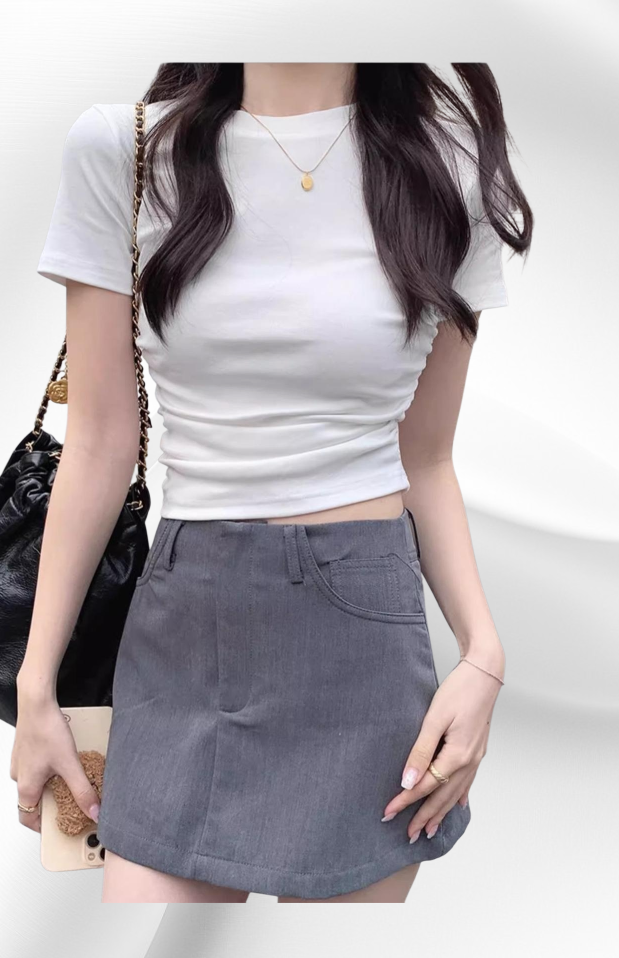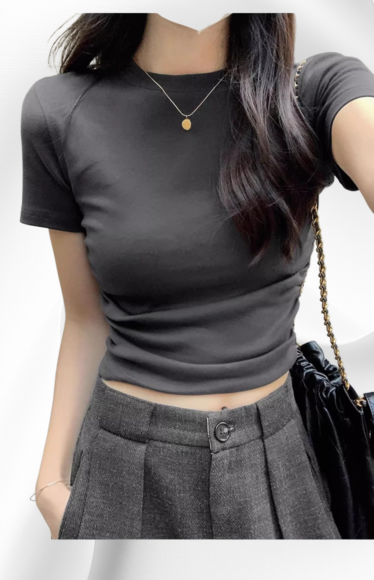 Modernes, figurbetontes Kurzarm-T-Shirt mit hohem Kragen für Damen. Weiches Material, unregelmäßiges Design, ideal für Sommer-Looks. Vielseitig kombinierbar für Alltag und Freizeit.