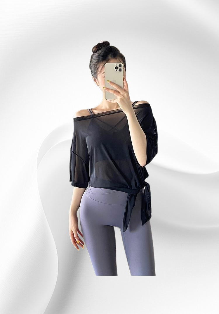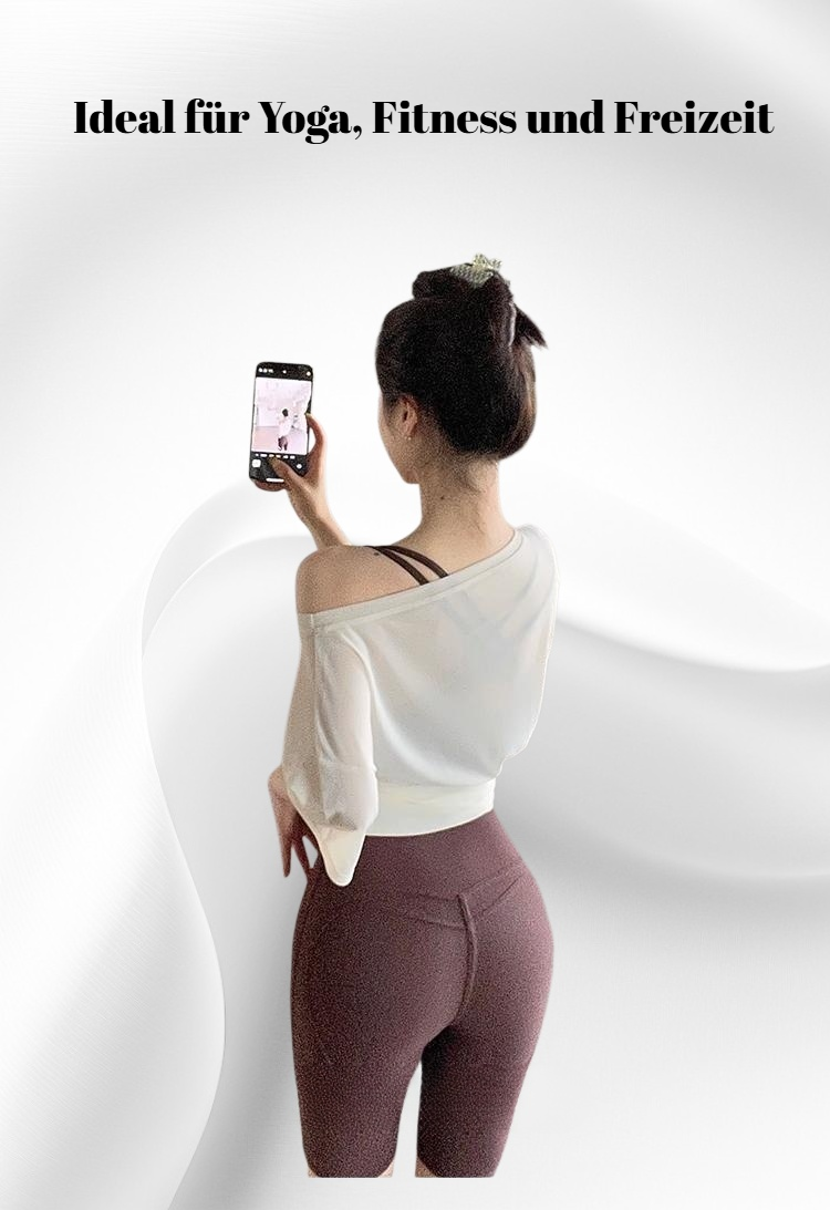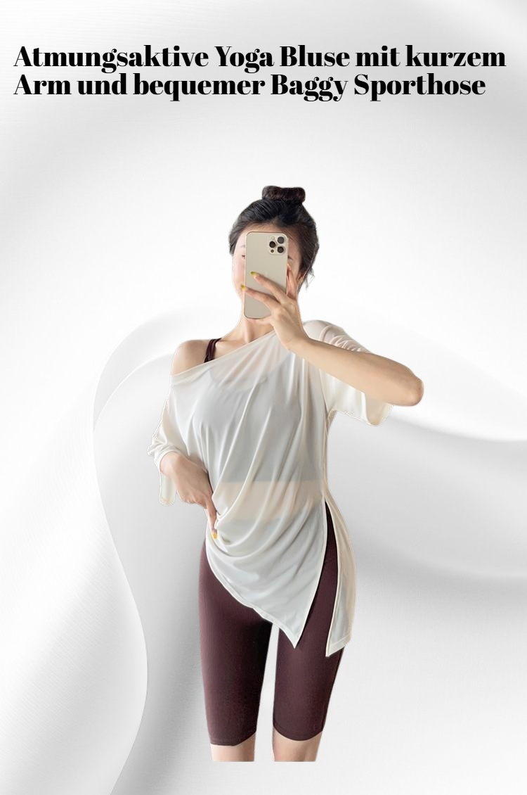 Atmungsaktive Damen Yoga Bluse mit Kurzarm und bequemer Baggy Sporthose, geeignet für Fitness, Yoga und Freizeit. Elastisches Material bietet Bewegungsfreiheit und angenehmen Tragekomfort.